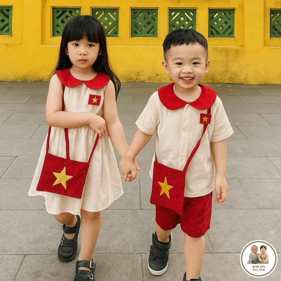 Đối với dịp lễ 2/9, kiểu dáng trang phục thường được thiết kế với phong cách truyền thống, mang đậm tính dân tộc. Bạn có thể chọn set quần áo với họa tiết cờ đỏ sao vàng, hoặc họa tiết truyền thống khác.