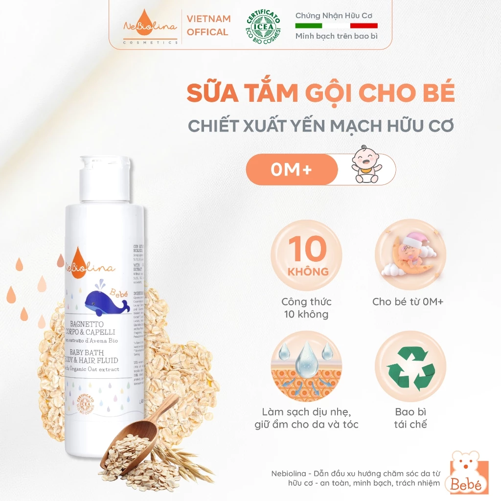 Sau khi nghiên cứu và thử nghiệm, tôi đã chọn sữa tắm gội cho bé NeBiolina dịu nhẹ và dưỡng ẩm chiết xuất yến mạch Hữu cơ 0M+ 200ml cho con mình. Sản phẩm này được chiết xuất từ yến mạch hữu cơ, không chứa hóa chất nhân tạo, chất bảo quản và chất tạo mùi.