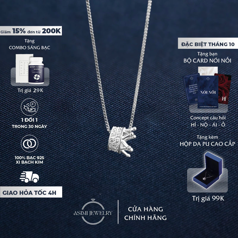 Ví dụ, dây chuyền vương miện bạc Ý S925 Asimi, dây chuyền bạc nữ xi bạch kim dây hộp Crown Line DC46 có giá chỉ 299.000 đồng, trong khi các thương hiệu khác có thể có giá cao hơn.