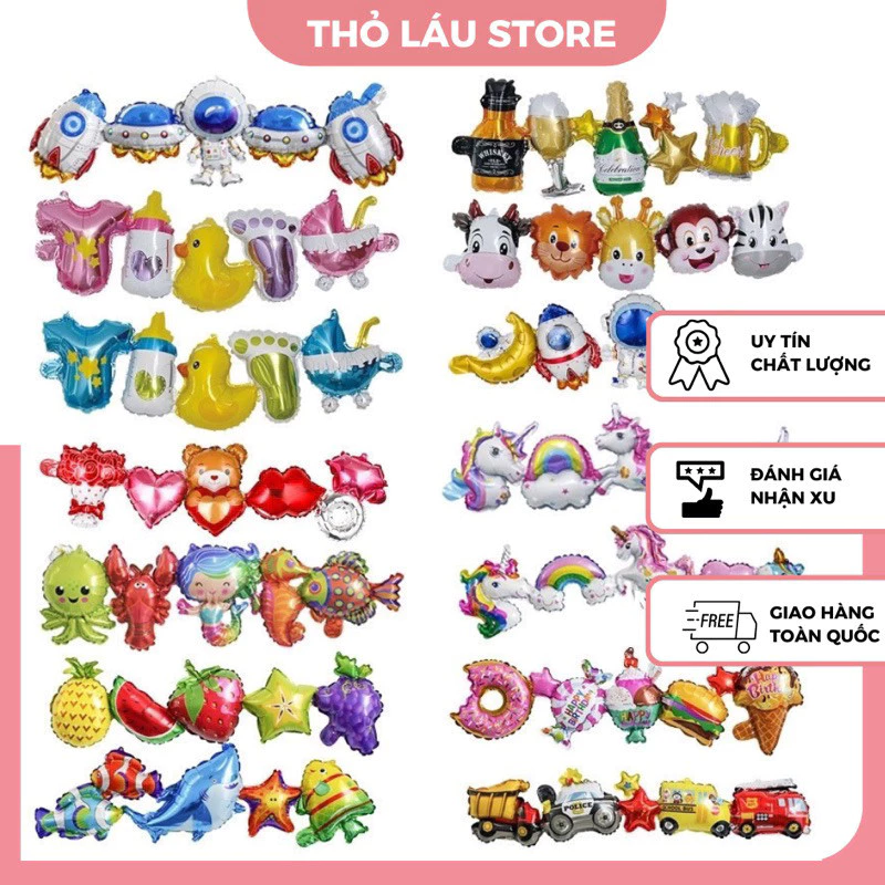 - Chất liệu đa dạng: Bong bóng hình chai ly bia, đồ ăn động vật, hộp quà, xe cộ.