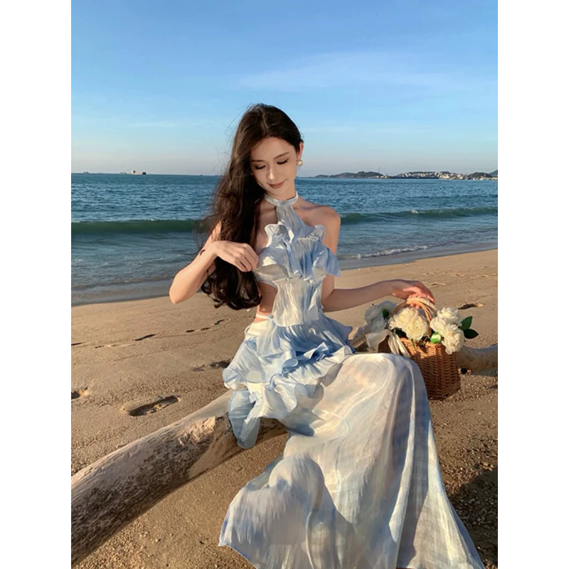 🔥 (Taoba0) kèm ảnh thật-Set váy đuôi cá hở lưng màu xanh ngọc, váy dáng dài tiên nữ quyến rũ, váy đi biển đi tiệc,váy tầng đang giảm giá!
